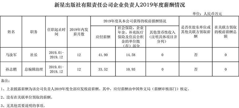 新星出版社有限責(zé)任公司企業(yè)負(fù)責(zé)人2019年度薪酬情況